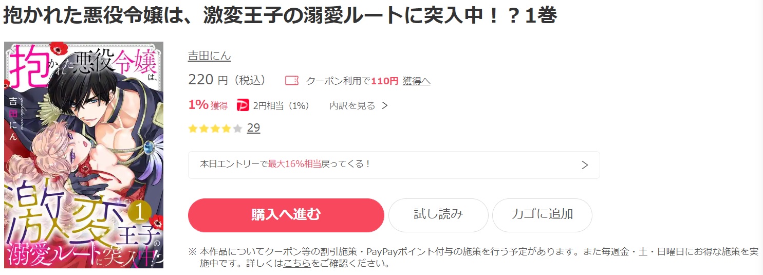 漫画『抱かれた悪役令嬢は、激変王子の溺愛ルートに突入中!?』は220円なので、登録時にもらったポイントを利用して、1~2巻を無料で読むことができます。