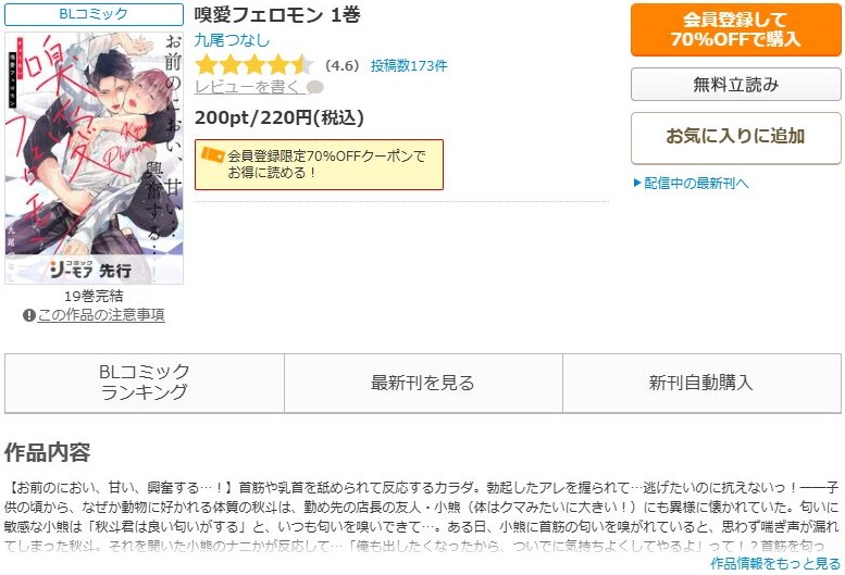 新規ユーザー限定クーポンをもらえるので、有効期限内に使えばお得に漫画『嗅愛フェロモン』を読むことができます。
